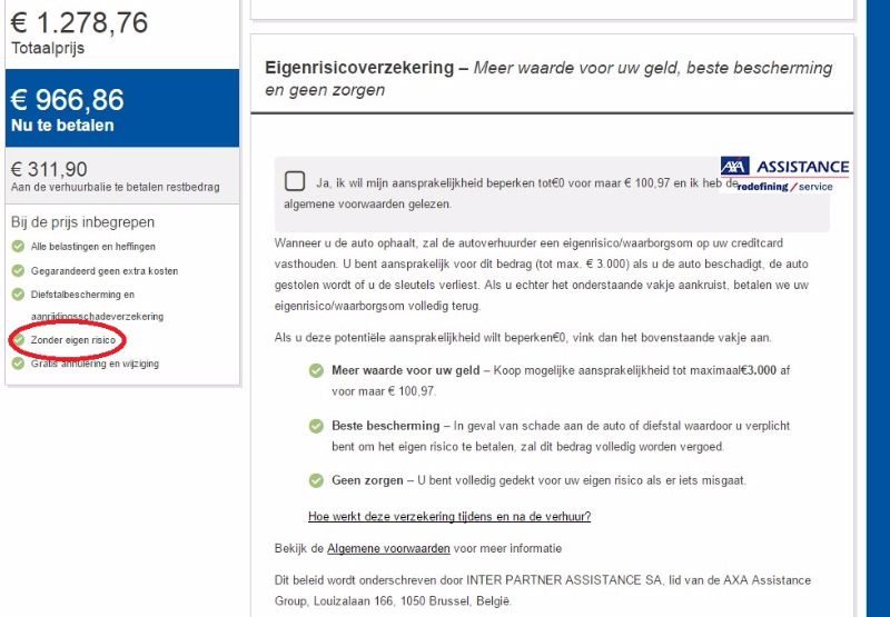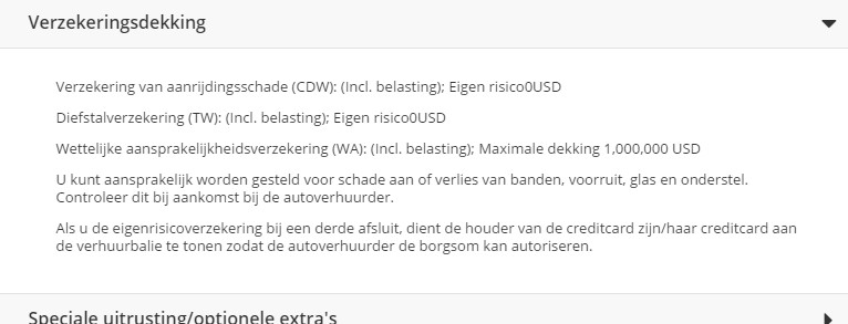 Jammer vind ik wel dat je niet snel kunt zien of de standaard verzekeringen erbij zitten. Er staat alleen diefstalbescherming en aanrijdingsschadeverzekering. Het zal allemaal wel in orde zijn, je huurt immers bij een Europese broker, maar toch..