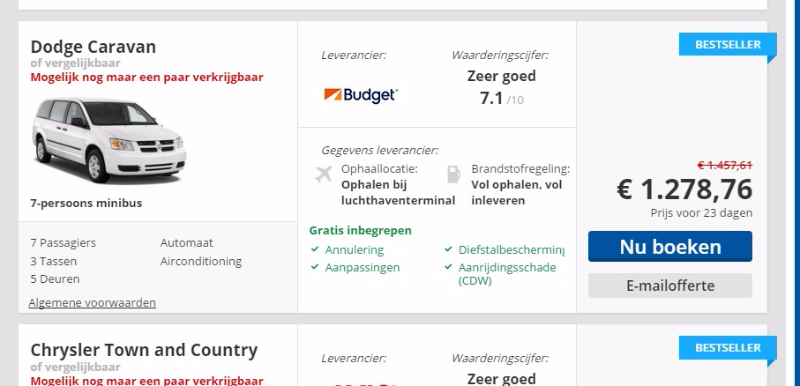 Ik heb via cheapcars.nl een minivan (Dodge Caravan) geboekt voor 24 dagen (17-7 t/m 9-8). Ophalen in Denver, inleveren in San Francisco.