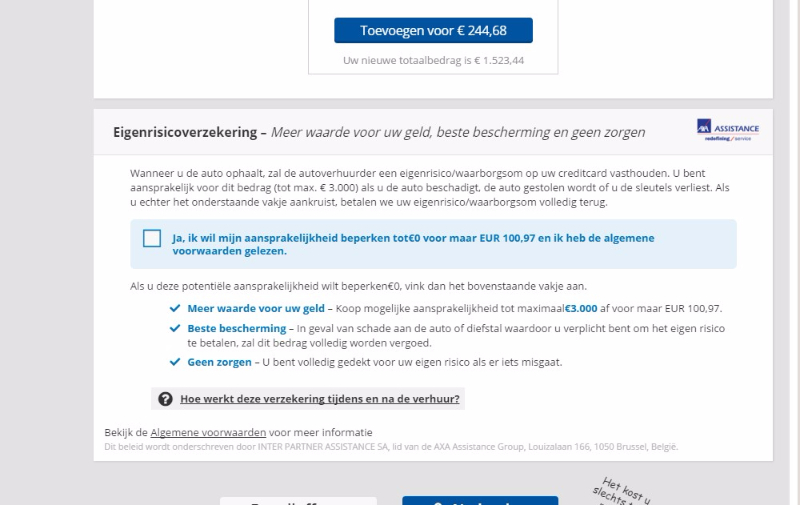 Bij de boekingsbevestiging lees ik niet echt welke verzekeringen er allemaal bij zitten (ik heb nog geen voucher ontvangen) en ik heb een “eigenrisico verzekering” afgesloten voor EUR 100,00. Verzekerd bedrag is EUR 3.000,00. Maatschappij is AXA.