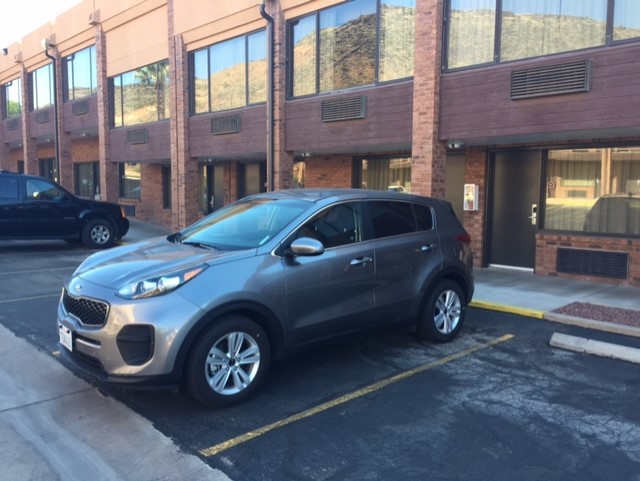 Keuzemogelijkheid of toegewezen: keuzemogelijkheid tussen 2 typen Jeeps en deze spiksplinternieuwe Hyundai Sante Fe. De greeter gaf ons de mogelijkheid om ook deze Standard SUV mee te nemen en hij raadde het ook aan, haha. Niet getwijfeld uiteraard, gratis upgrade en gloednieuw. Daarnaast vonden we de kofferbak van de Jeeps erg klein. Nog maar 70 miles (!) op de teller en een tijdelijk nummerbord. Alleen nog maar vanaf de garage mee gereden tot in de Alamo garage. Helaas geen volle tank benzine, maar dat namen we op de koop toe.