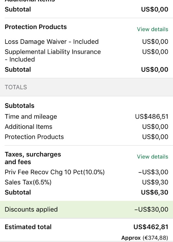 @Pete.Z dat klinkt als een goede prijs inderdaad. Nu heb ik nog nooit bij Dollar geboekt; als ik op dollar.com een prijs opvraag en mijn land is NL, zie ik geen verzekeringen bij de prijzen inbegrepen. Komen die er pas bij als je je gegevens invult of zijn die al inclusief? Kan er niets over vinden.Pete.Z schreef:ondertussen via rentalcars bij Dollar een midsize suv voor $245 gehuurd
