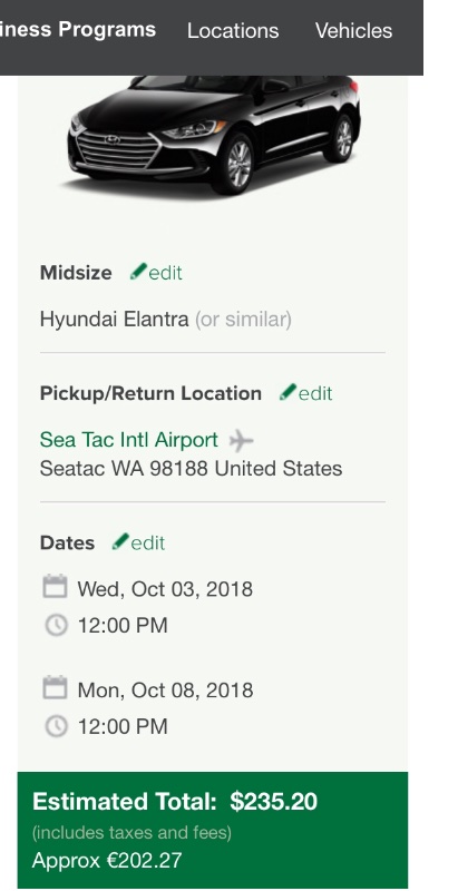 Ik dacht me hier eens in te gaan verdiepen. Ik wil op 5 september een auto huren in Albuquerque en deze op 24 september inleveren in Denver. Ik heb een Emerald Club account aangemaakt en kom nu uit op een totaal bedrag van maar liefst $1746. Dat is ruim 1000 dollar duurder dan bij concurrenten als Budget en Thrifty. Daar kan ik weliswaar niet mijn eigen auto kiezen, maar dat is me ook weer geen 1000 dolllar waard