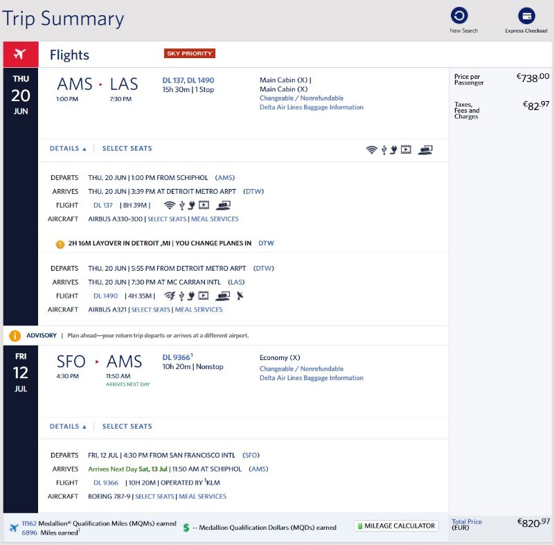 Maar goed, bij DL krijg ik vrijwel hetzelfde tarief (zonder die gekke 10 euro boekingskosten): EUR 740,97. Dat is basic economy. Het normale tarief is op Delta.com 80 euro duurder: EUR 820,97: