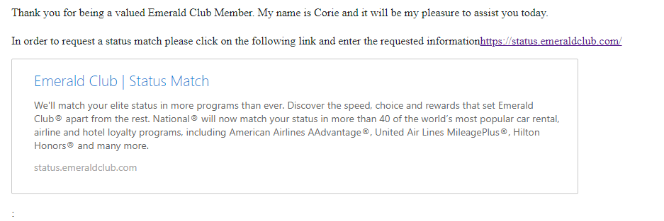 Ik zou een e-mailtje wagen naar National met de link en je membership number en vragen of ze alsnog willen matchen naar Executive Elite.