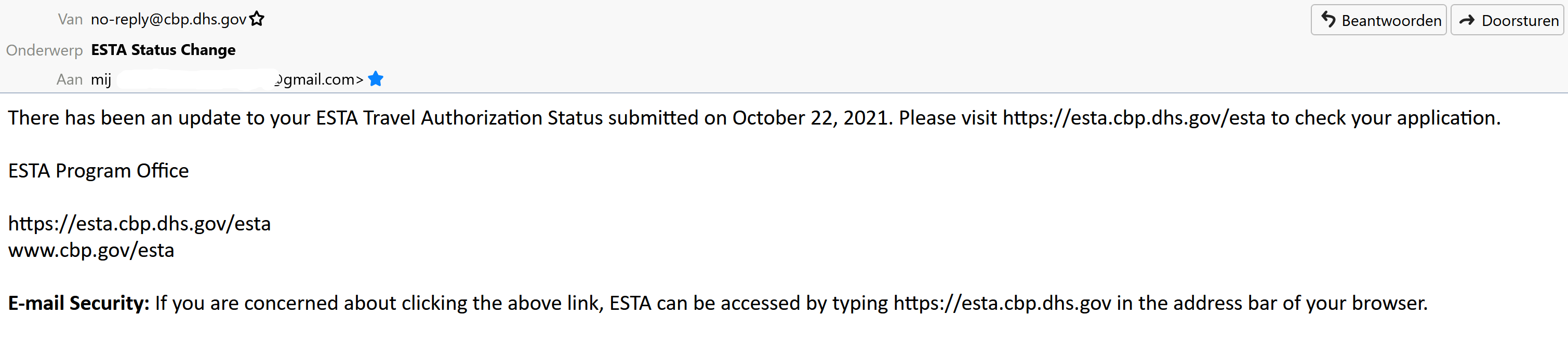 Maar de volgende dag kreeg ik wel een email van het cbp dat er een wijziging in mijn ESTA status was (in mijn geval goedgekeurd).