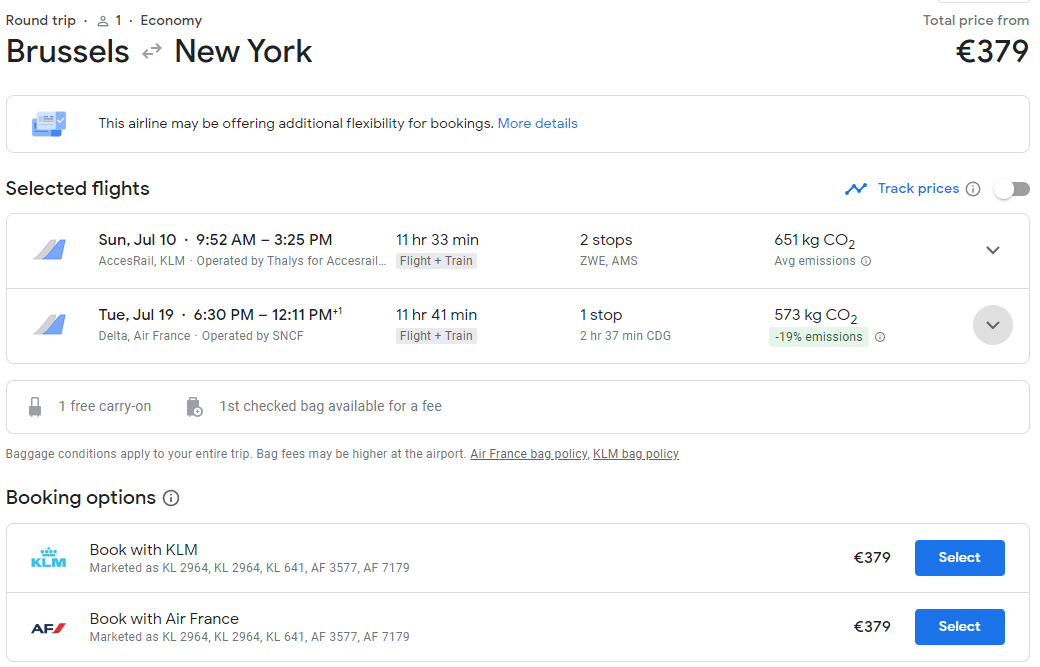 Heb je deze gezien? KLM/Delta, wel met overstap trein, terug niet via AMS maar CDG voor 379,-...