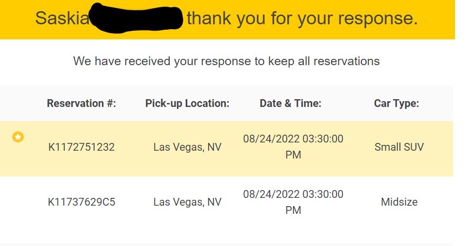 Het kan bij Hertz niet meer. Als je probeert om een dubbele boeking te maken dan krijg je een foutmelding met de mededeling "Reservation on file".harryh schreef: ↑11 mei 2022, 13:13Twee is uiteindelijk misschien toch niet okay, ik heb dat ook gehad; Zonder dat ik er een melding van kreeg bleek een paar weken voor vertrek dat ze de goedkoopste boeking toch hadden gecanceld. Gelukkig bleken ze die wel weer terug te kunnen halen. Opletten met dubbele boekingen dus.