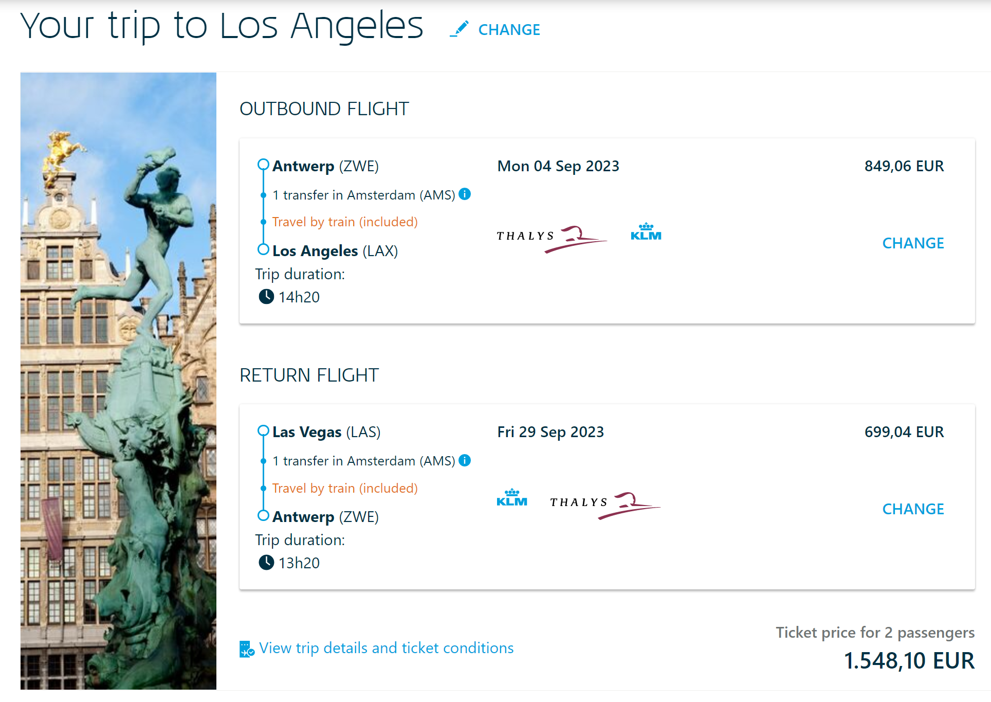 Vanaf Antwerpen is nog iets gunstiger, waarbij je op de terugreis de Thalys kan overslaan. Bovenstaand is regular economie (dus met bagage en stoelreservering).