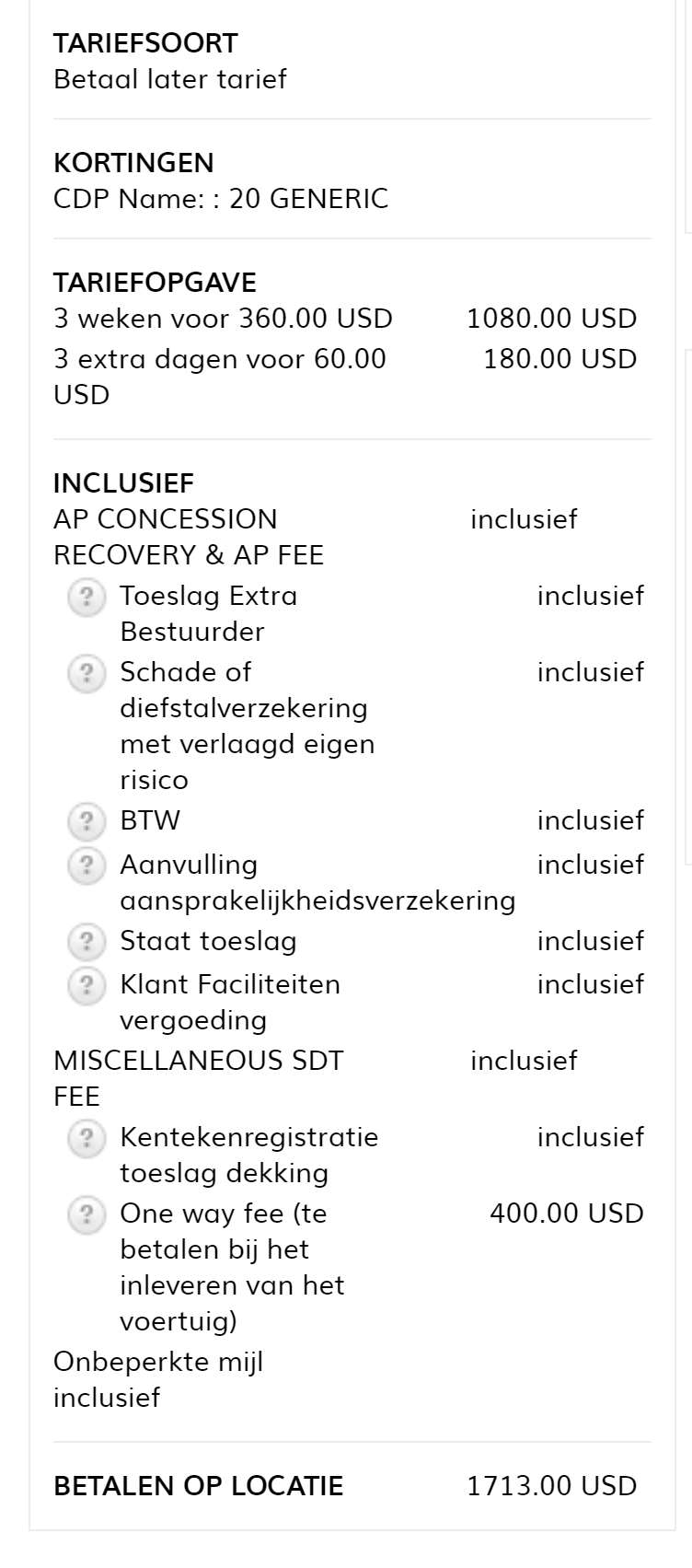 Hopelijk geeft dit inzicht hoe Hertz de kosten opbouwt en waarom het totaal niet altijd overeenkomt de bedragen die je ziet staan. Waarom men die Fee en Tax niet gelijk in de boeking laat zien is mij niet bekend, zou het wel wat duidelijker maken.