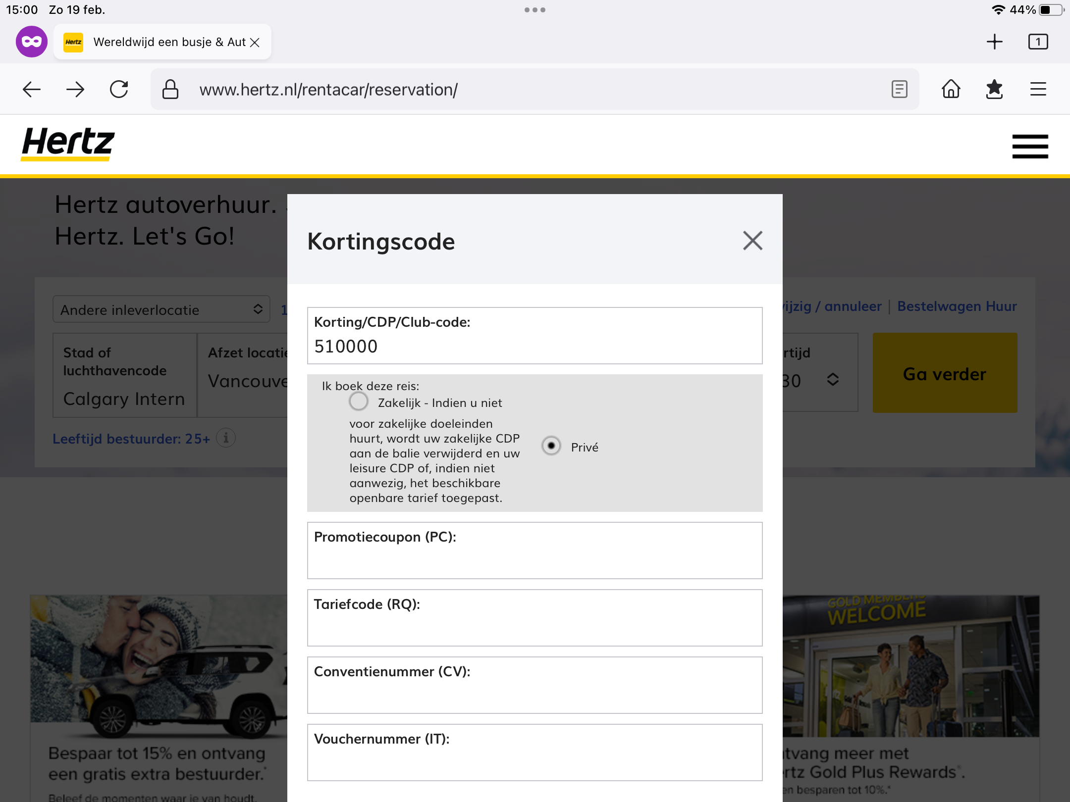 Mag ik die 510K code op deze manier gebruiken? En vul ik hem juist in? We zijn nog geen gold member bij Hertz.