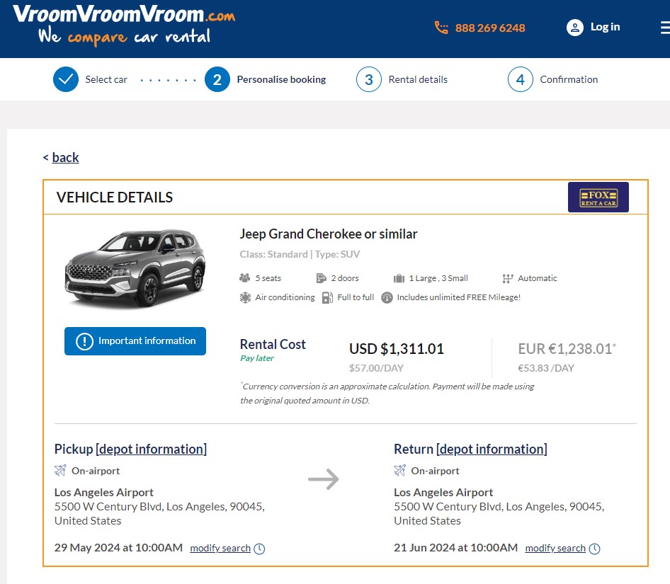En let op , De prijzen via UScarhire zijn in ponden. Dat is iets anders dan USD.