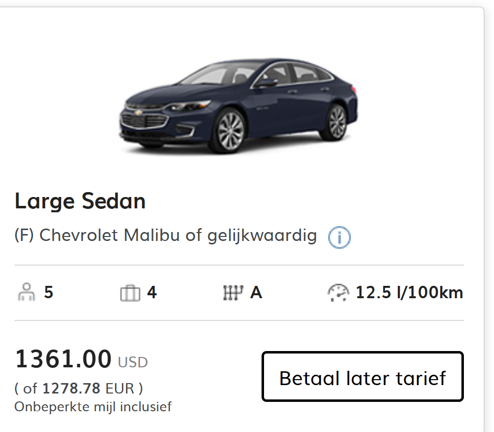 Ik heb nu een midsize voor 750 dollar (Hertz punten toegepast, anders 925 dollar), bij Alamo 1300 euro. Een midsize SUV is bij Hertz 1000 dollar, bij Alamo 1350 euro.