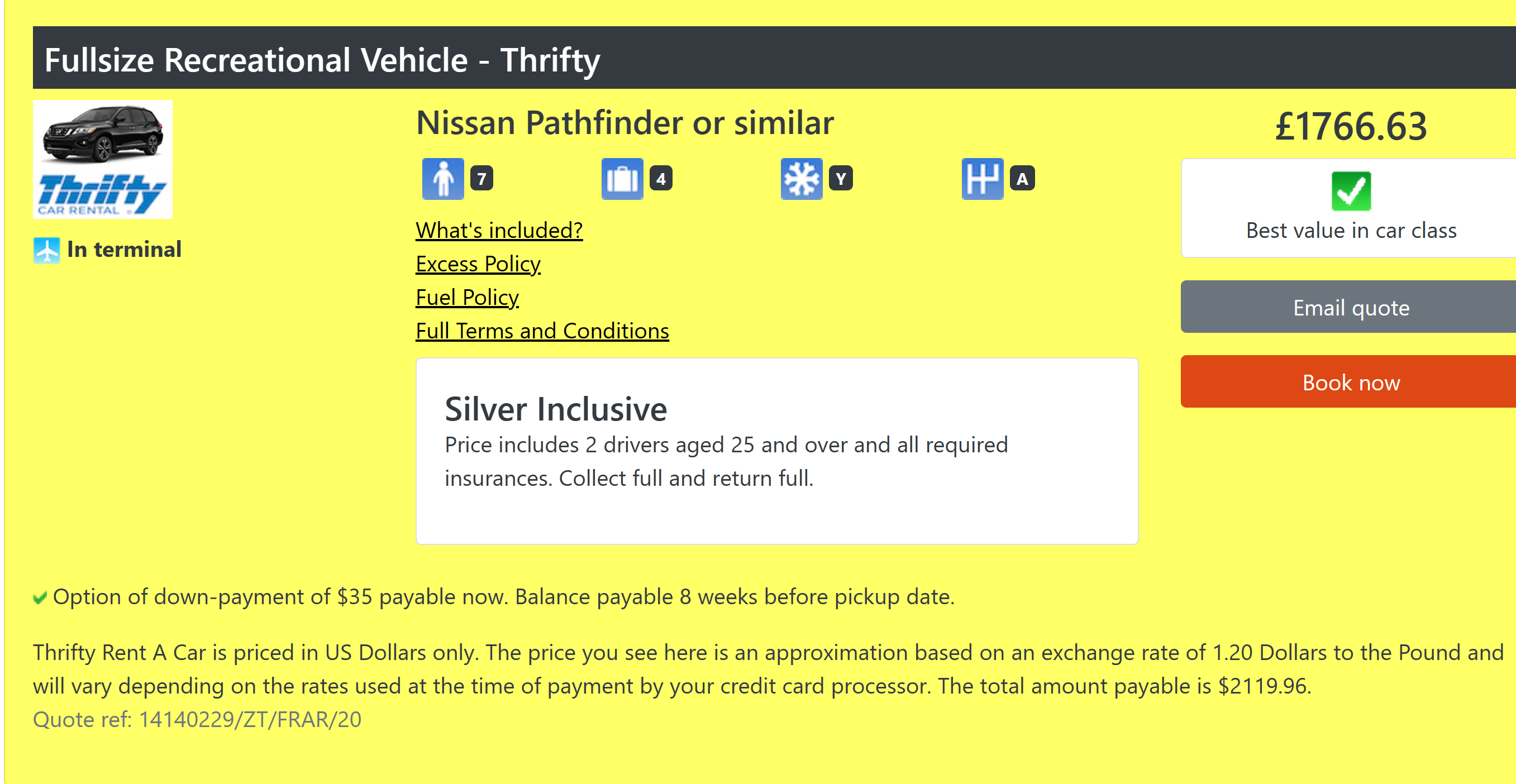 Of is een intermediate SUV dan veel ruimer en dus een betere deal? Bedragen zijn in dollars hier. Dit is bij uscarhire/Thrifty