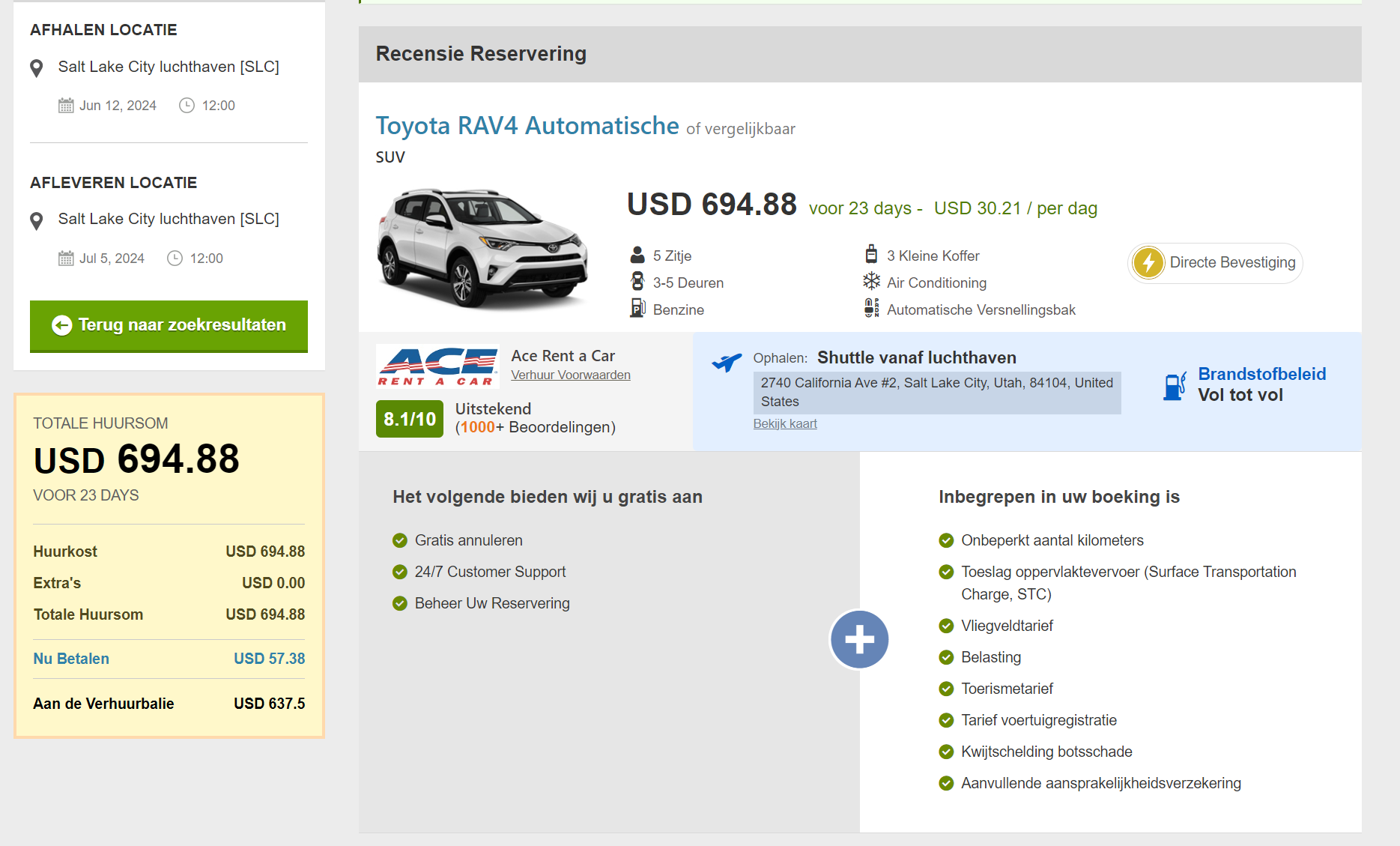 Ik vind nu een Toyota RAV voor $ 700 (23 dagen) en een grotere SUV voor bijna $1100 Het lijkt alleen wel; of er toch nog eigen risico is van tussen de $250. . Dat risico wil ik nog wel nemen, vraag ik een ANWB creditcard aan en dan is dat ook afgedekt.