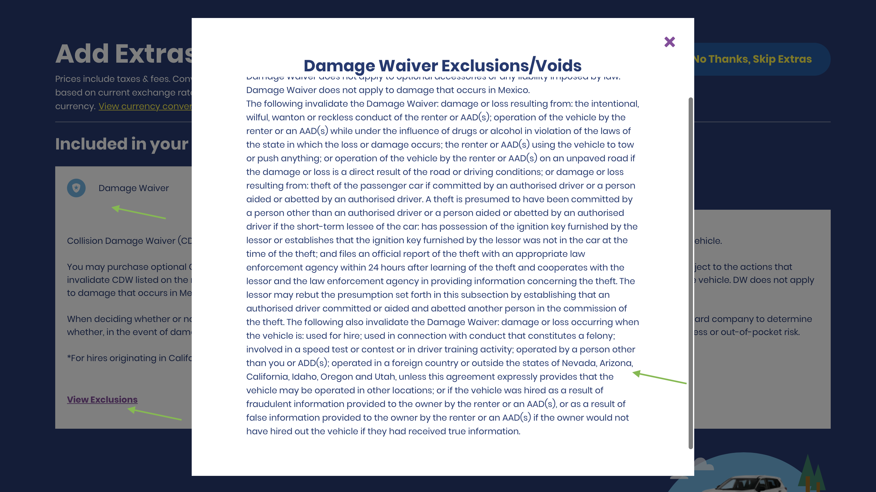 Ik heb nogmaals een reactie teruggestuurd, omdat ze in hun reserveermodule nog steeds de exclusie tonen: 'We mogen dus met een reservering via UStravel.nl rijden in alle staten ondanks dat het niet zo staat in de Damage Waiver Exclusions/Voids in jullie reserveermodule? Kun je misschien de bevestiging van jullie Alamo contactpersoon delen? Dan zijn we helemaal gerustgesteld.'