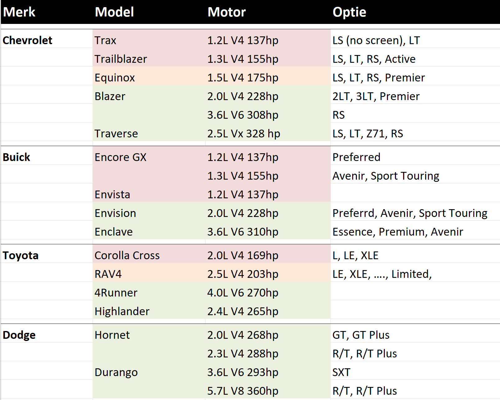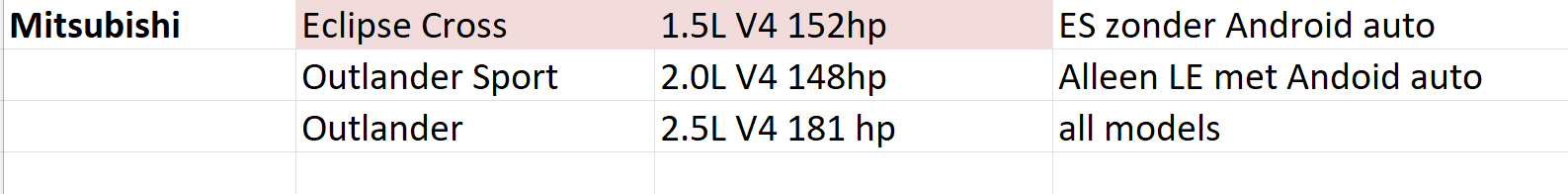 Voor het geval ik ergens keuze heb, houd ik voor mezelf een overzichtje met auto's (mid/std SUV) bij een aantal karakteristieken. Zoals motoruitvoering/vermogen en of het model Android Auto heeft. Weinig vermogen of geen Android = rood (oranje is acceptabel, groen = voorkeur). Dus een kwestie van uitzoeken welke merken/modellen bij de verschillende verhuurders in gebruik zijn en op de website van de fabrikanten de details uitpluizen.