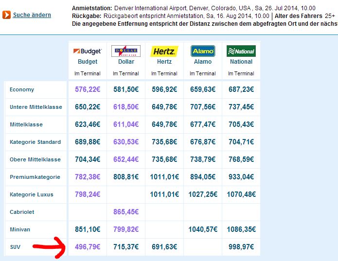 Ik zie voor de periode 23/05 - 20/06 bij ebookers.de een SUV van Avis voor € 768,50 + $ 300,- drop off kosten.