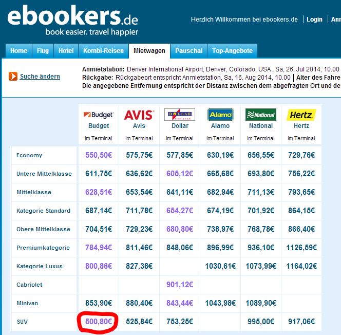 Ik zie voor de periode 23/05 - 20/06 bij ebookers.de een SUV van Avis voor € 768,50 + $ 300,- drop off kosten.
