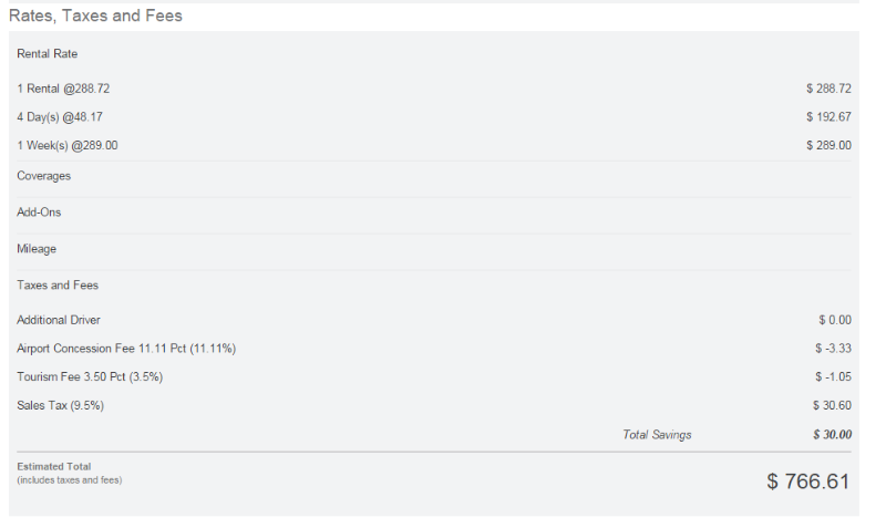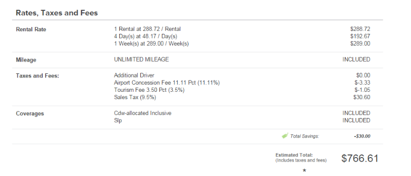 Zelfs Alamo met trade en $30 off coupon (AD2338FDF) komt niet in de buurt door de $150 one-way fee. Daar kom ik vandaag op $620 (EUR 557) voor een mid-size. Compact is iets goedkoper ($611), maar goed, voor $9 lijkt het me een no-brainer om te upgraden. Voor $30 meer rij je "Standard" (SDAR) en voor $120 meer een mid-size SUV (IFAR).