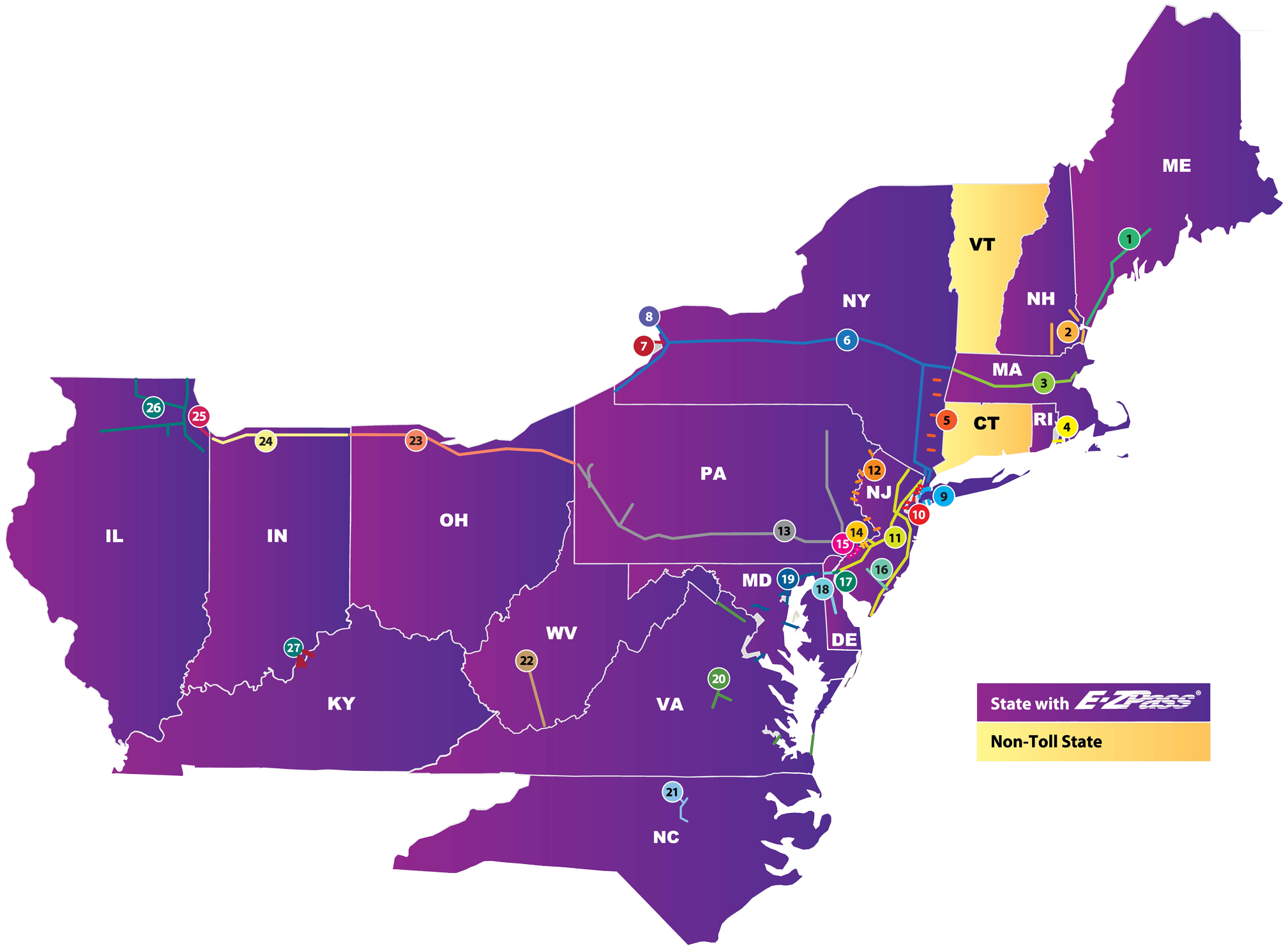Purple states use E-ZPass or have an electronic tolling system that is compatible with E-ZPass.