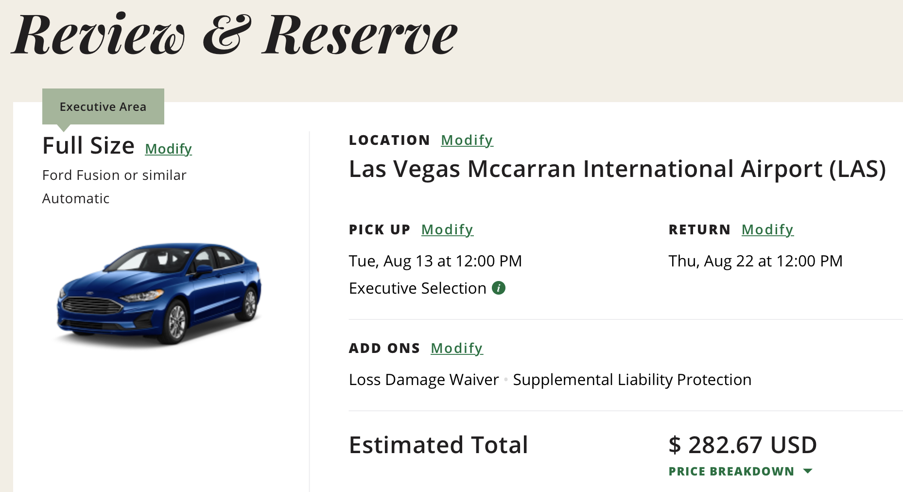 Voorbeeld: Las Vegas is van 13-22 augustus en we huren een Standard SUV (SFAR) bij Alamo: Nissan Pathfinder of similar. Totaal voor €437 met 2e chauffeur gratis.