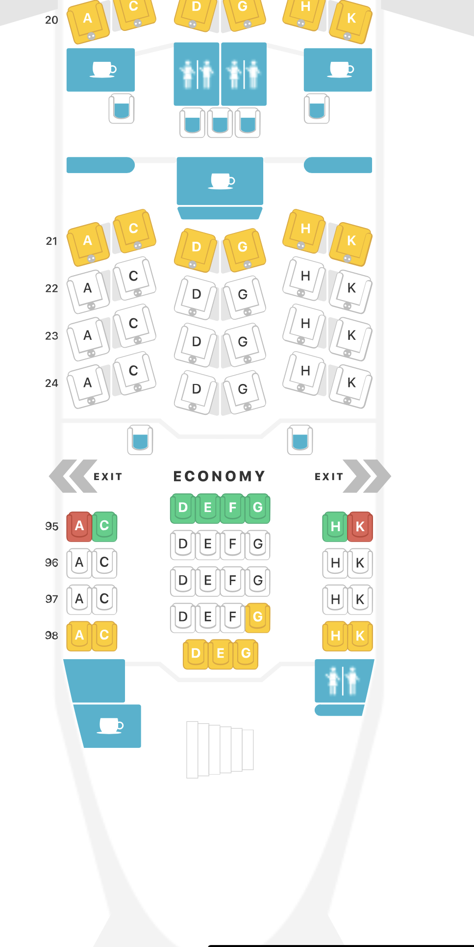 Zie overigens niet zo direct het voordeel om nog veel verder achterin te zitten. Met eten ben je dan vaak als laatste aan de beurt omdat ze vanuit achterin eerst naar voren lopen met de karretjes en dan terug naar achteren werken.