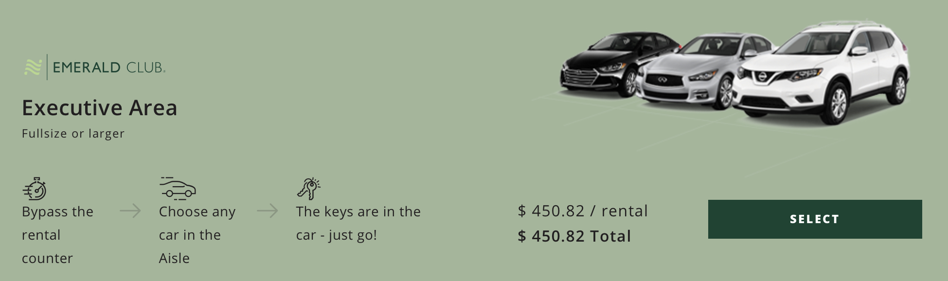 Upon arrival, please proceed to the Executive area to choose your vehicle.