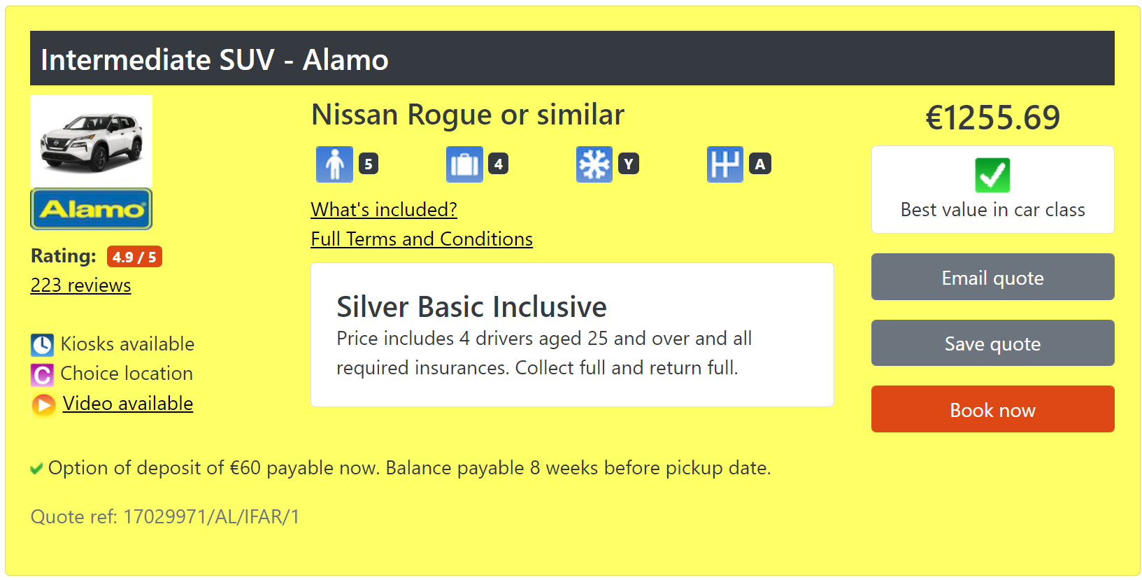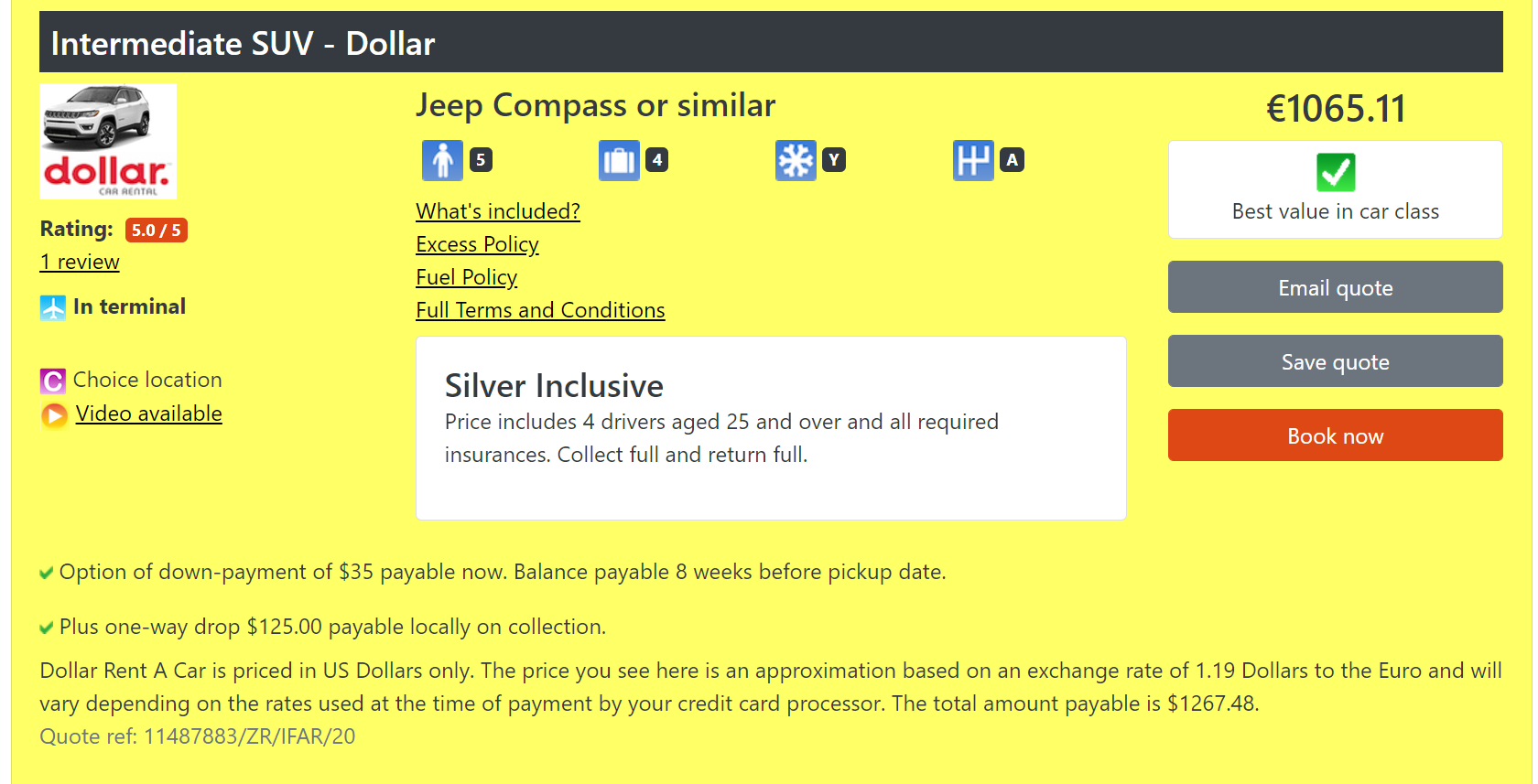 Als ik die data invoer op UScarhire.com (met code 388) zijn er wel goedkopere opties. Ongeveer € 1170 +$125 one-way toeslag. Dat is voor een standard SUV (SFAR), dan heb je iets van minimaal het formaat van een CX-5, waarschijnlijk groter. Een IFAR is er al voor €1000 + one way. Extra bestuurders en alle verzekeringen zijn inbegrepen.