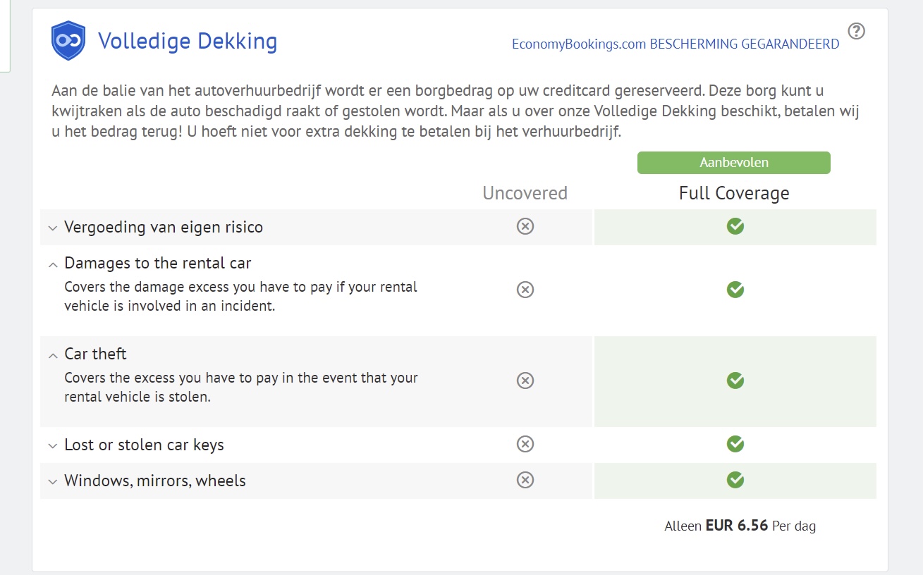Zitten alle benodigde verzekeringen erbij? In de voorwaarden staan de verzekeringen genoemd. Waarom kun je bij het boeken dan alsnog kiezen voor Full Coverage? Daar worden toch deels dezelfde verzekeringen genoemd?