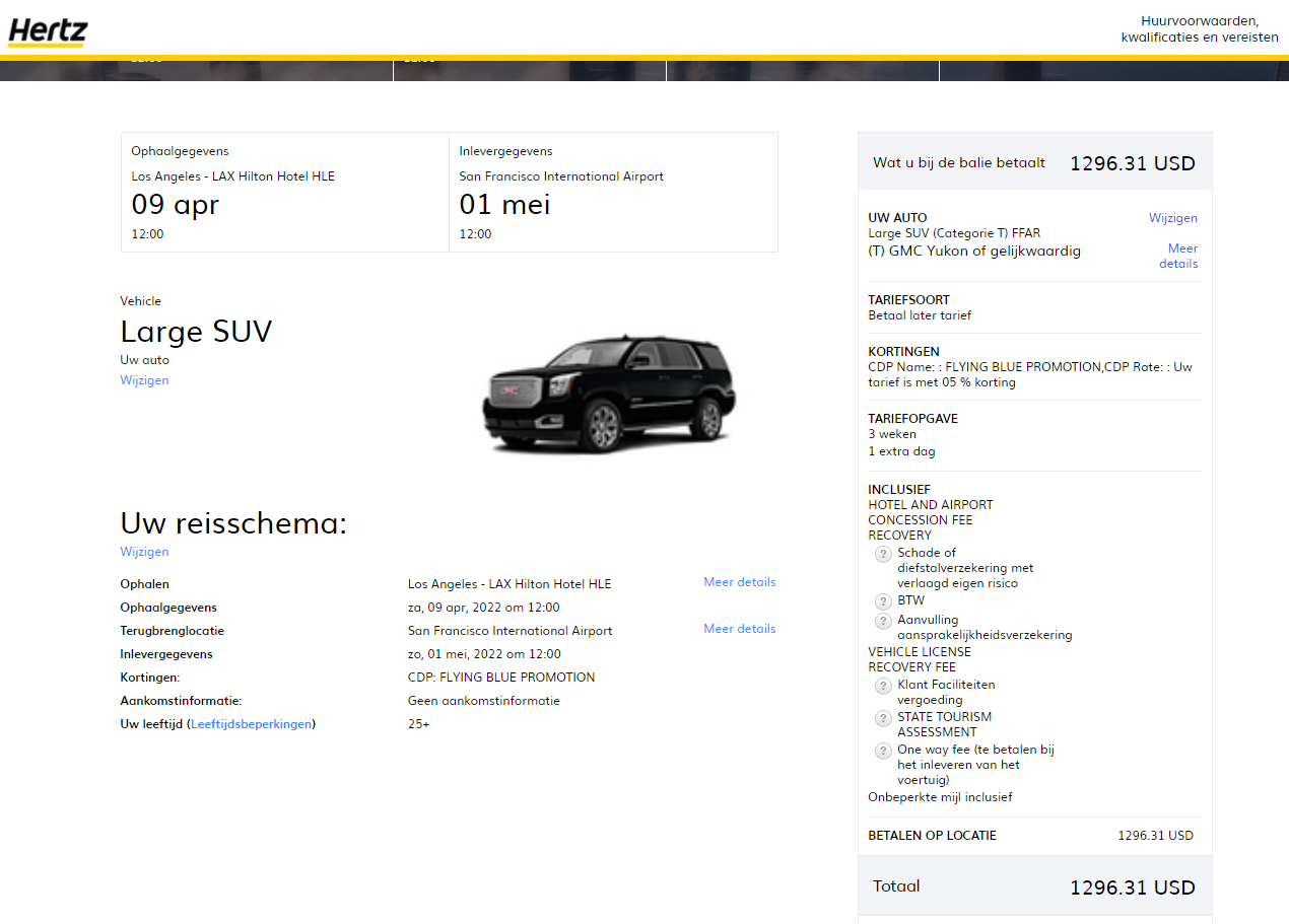 Hier komt het ook nog steeds op 2300 eur voor 19 dagen LAX naar SFO april std suv. Op uscarhire voorlopige zelfde kunnen vastelggen voor 1200 euro op hoop nog wat beter te vinden.