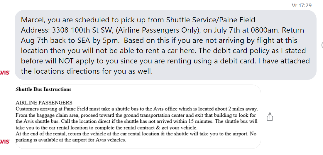 Locatie-specifieke condities (onder ID en rijbewijs); Die return ticket heb ik, maar niet van Paine Field. En in de bevestigingsmail wordt daar niet om gevraagd.