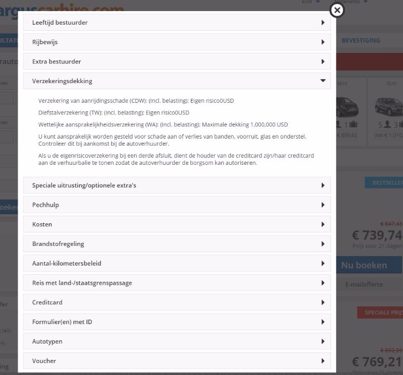Wanneer je de auto ophaalt, zal de autoverhuurder een eigenrisico/waarborgsom op jouw creditcard vasthouden. Je bent aansprakelijk voor dit bedrag (tot max. € 3.000) als je de auto beschadigt, de auto gestolen wordt of je de sleutels verliest. Als je echter het onderstaande vakje aankruist, betalen we jouw eigenrisico/waarborgsom volledig terug.