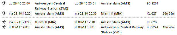 Ik vind het verhaal erg tegenstrijdig, want er is nogal een verschil tussen kunnen en moeten en dan als laatste regel zoiets te zetten.Njit schreef:Annie: Dat heb ik gezien. Maar dat * staat enkel bij de onderste twee regels. Niet bij het verhaal over van Antwerpen naar Schiphol. Nu worden wij gewoon afgezet op Antwerpen dus we maken de reis gewoon zoals hij hoort. Maar KLM zou het best wat duidelijker mogen neerzetten op hun website..