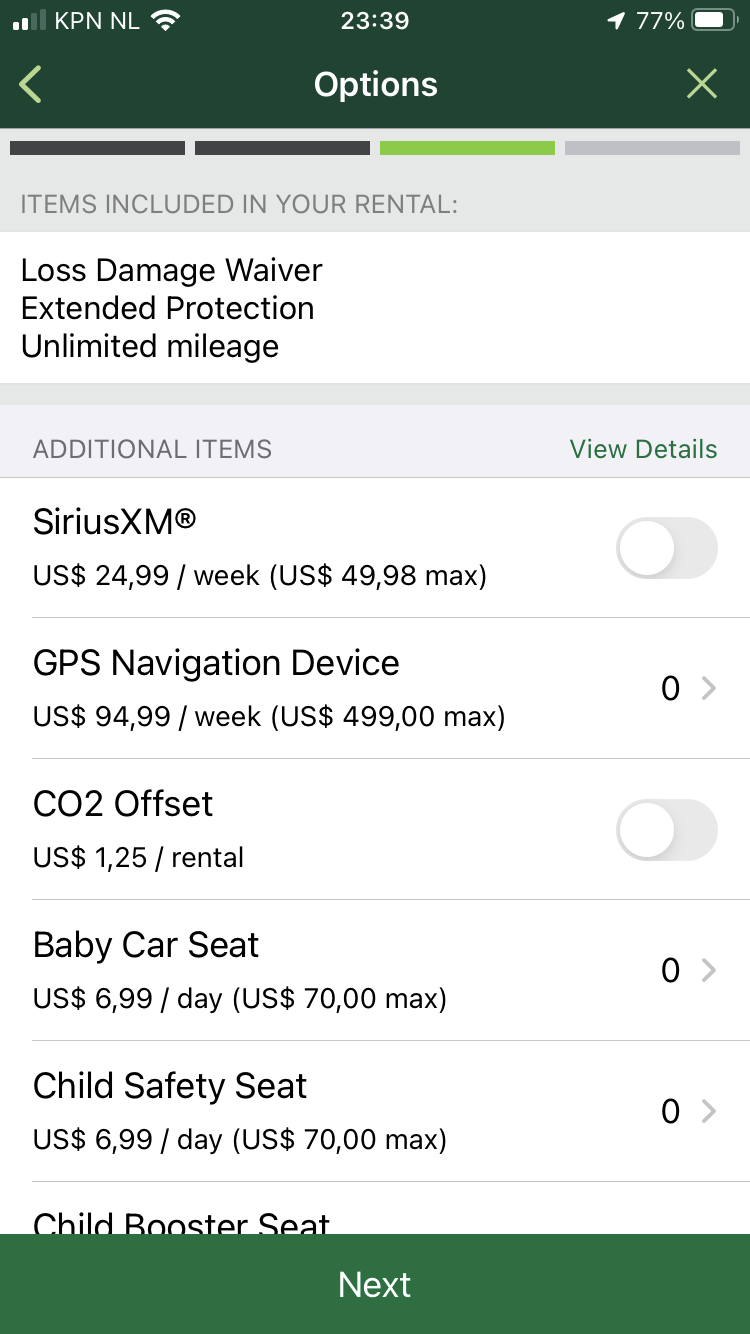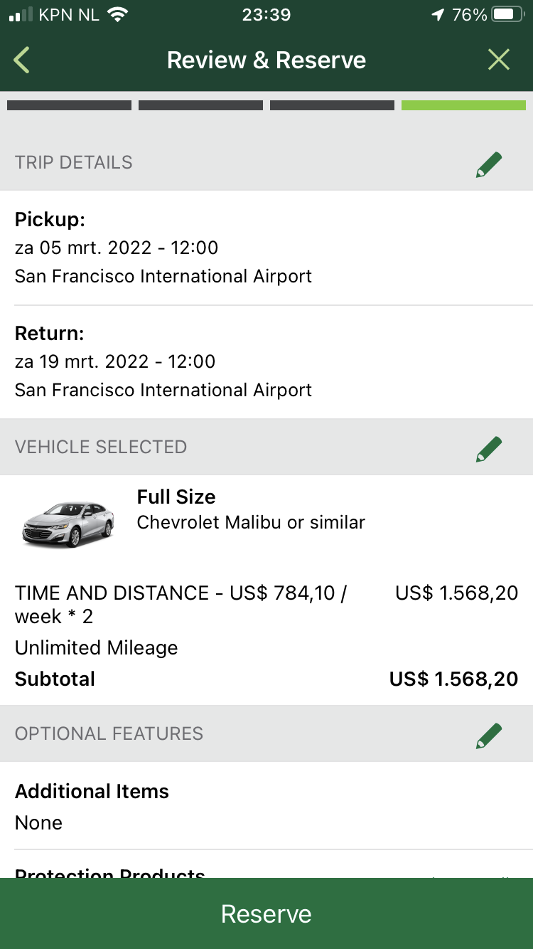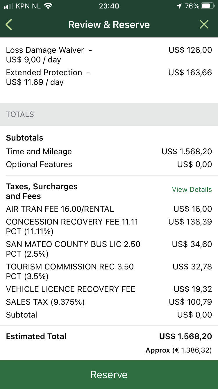 Sowieso zijn er hele gekke dingen in de app aan de hand. Zie hieronder de huur voor precies 2 weken. Ik snap de rekensom hier dus niet. Per week $382, voor 2 weken $918. Dat zou dan toch $764 moeten zijn? Okee, even doorklikken. Met 5005946 zitten LDW/SLI erbij in. Kom je in het eindscherm, is de eindprijs ineens $1568.
