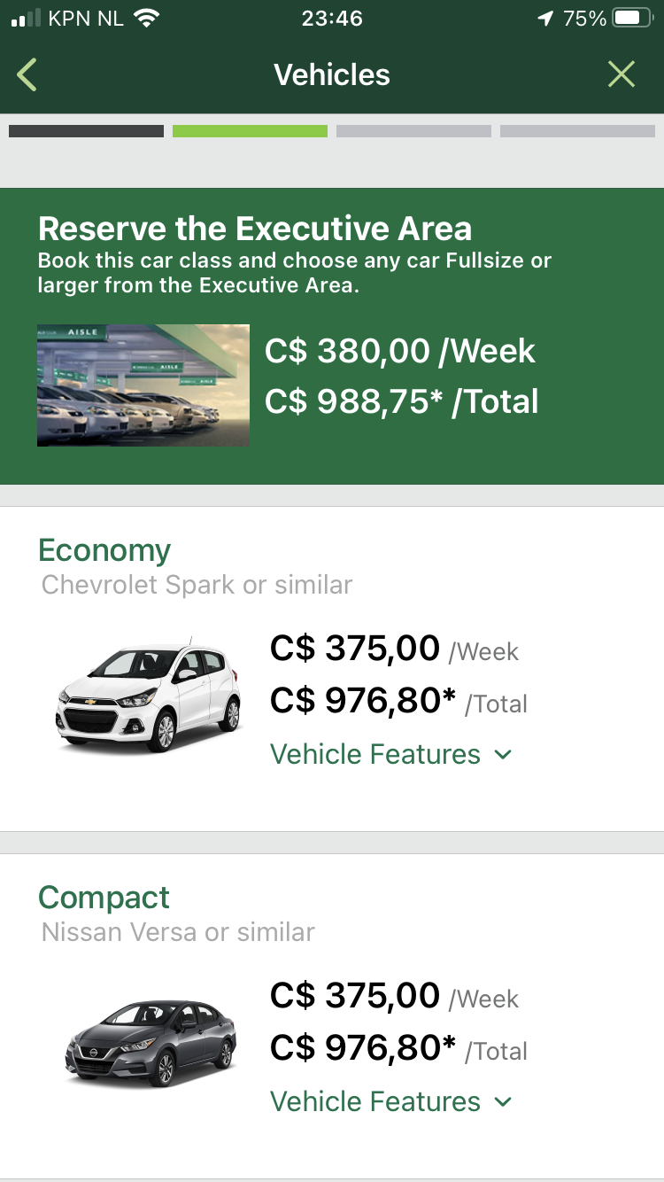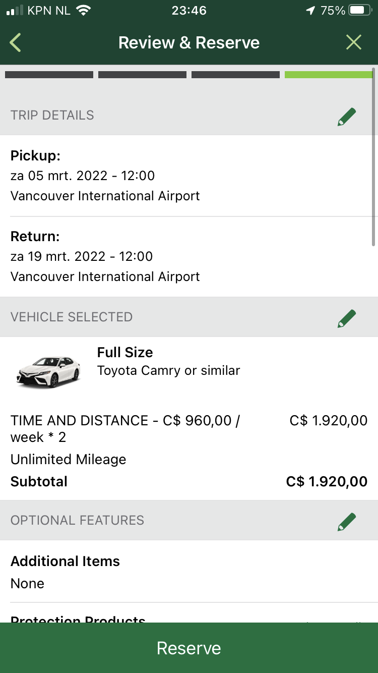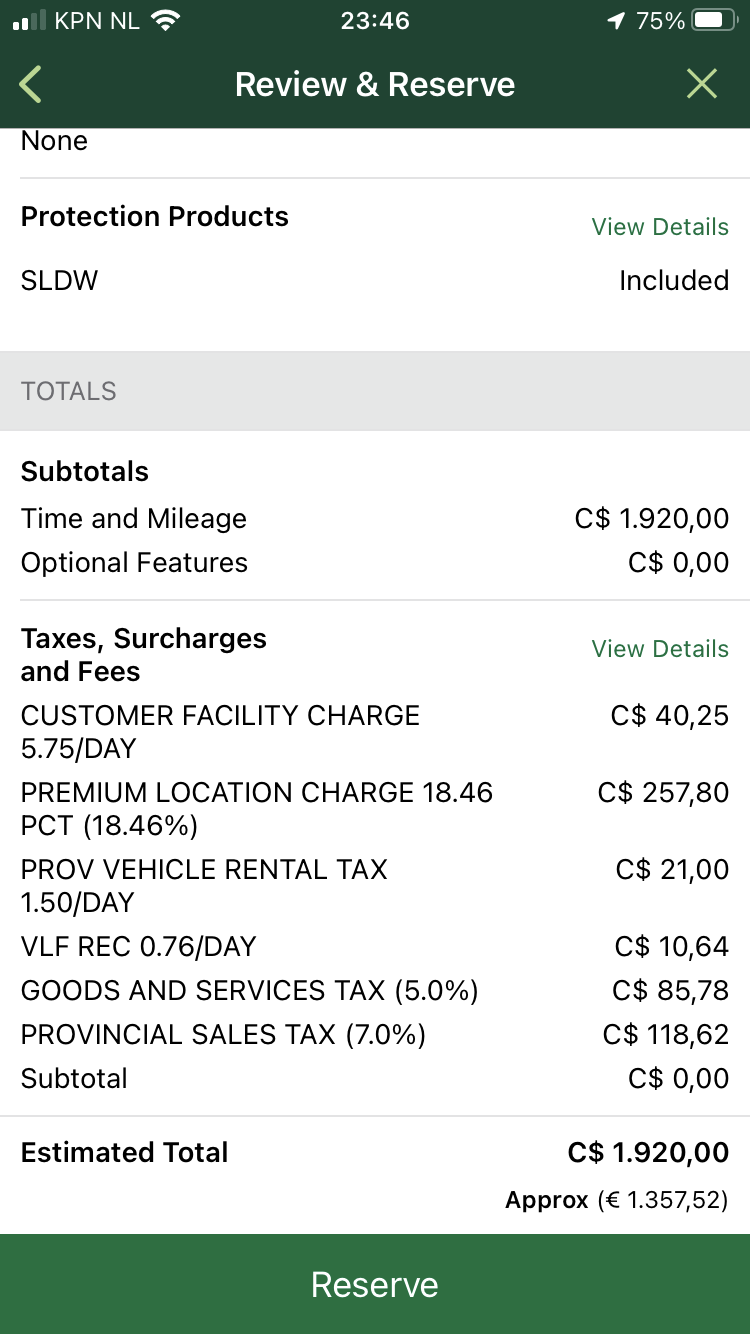 Nog maar eens proberen voor Vancouver. Weekhuur C$375, voor 2 weken C$976. Met 5005946 is LDW inbegrepen. Door naar het eindscherm. Eindprijs: C$1920, oftewel meer dan het dubbele dan de getoonde prijs. Plaatjes in de post hieronder ivm max van 5 per post.
