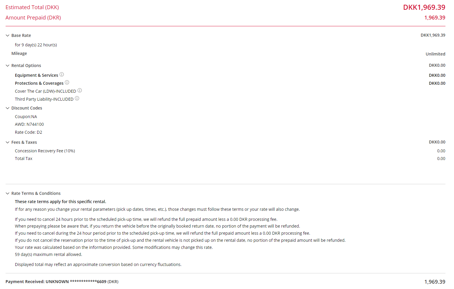 Jouw prijs zal wat hoger zijn ivm hoogseizoen. Ik gebruik avis.is omdat je de taal daar kunt instellen. Je kunt op onderstaande manier ook op avis.dk kijken of je daar een betere prijs scoort.