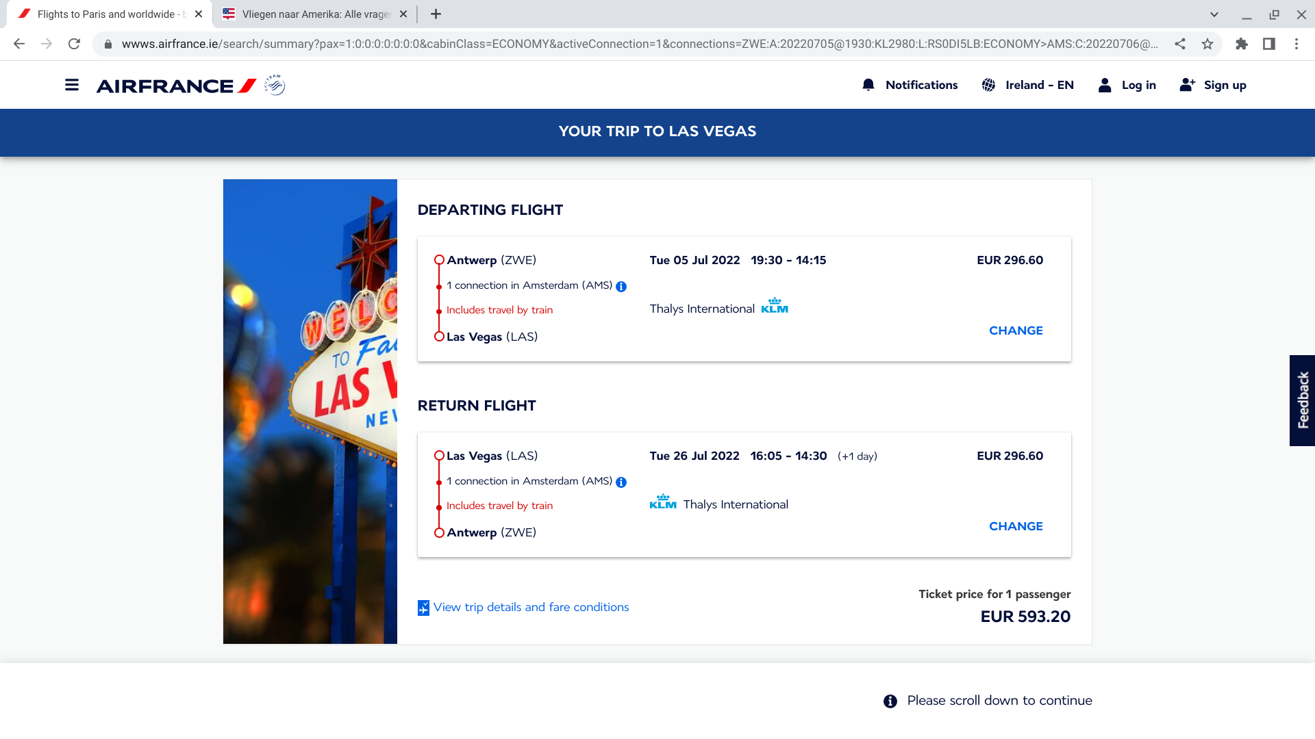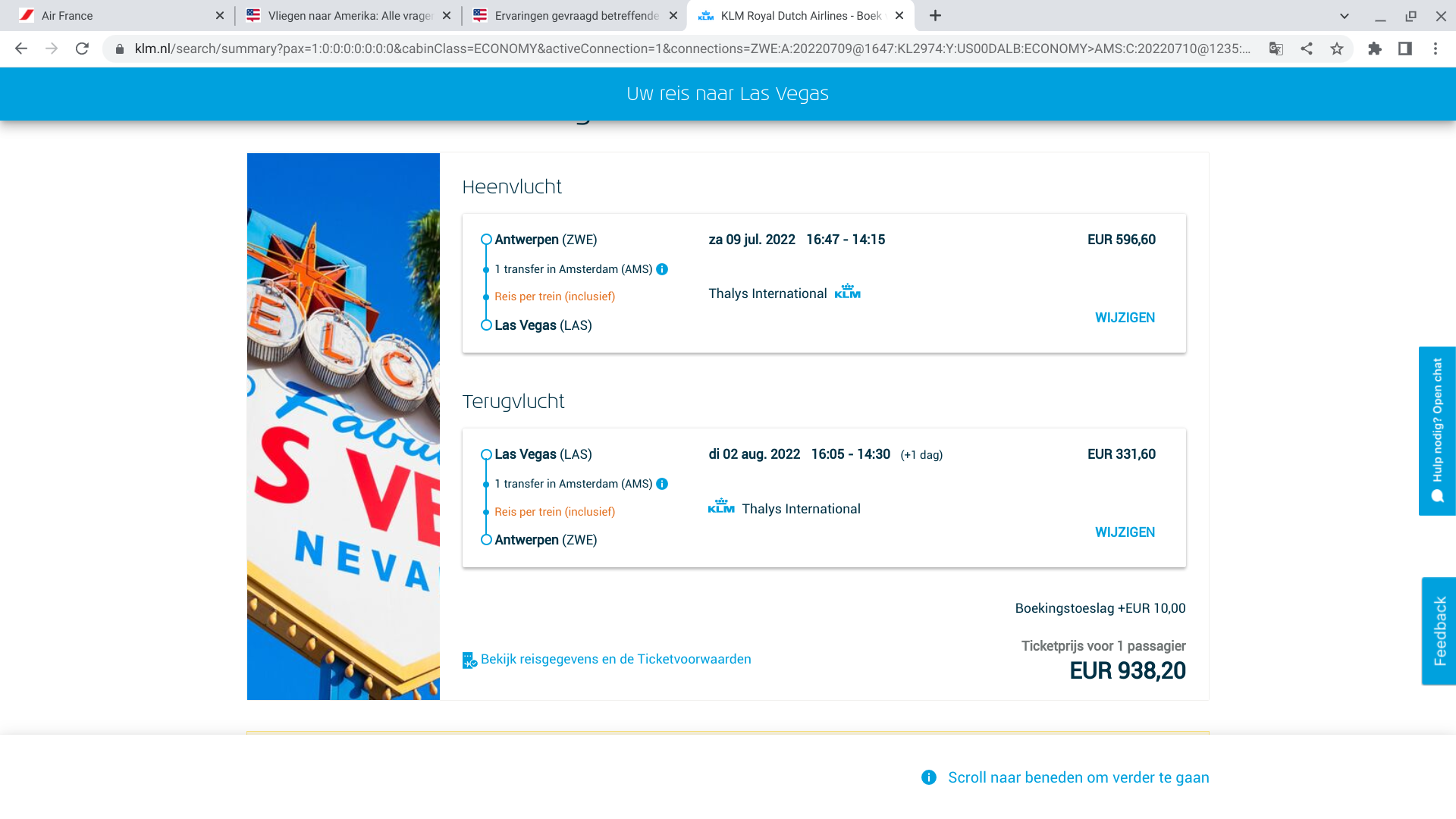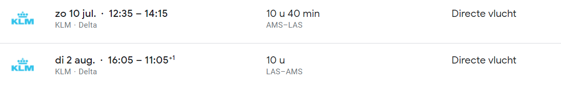Interessant (zeer interessant zelfs), maar voor de voor ons geldende datums kom ik hier niet uit. Wij vertrekken op zondag 10 juli en willen terugvliegen op dinsdag 2 augustus (alle overnachtingen en excursies al geboekt, geen wijziging mogelijk in de datums). Alleen de reis een dagje eerder laten vertrekken en een dagje eerder terug zou kunnen als het veel geld scheelt (dan beginnen we met 2 nachtjes Vegas en eindigen met 1 nacht ipv andersom)bedeve schreef: ↑20 apr 2022, 10:43Ik keek even met jou mee @mikekiwi en liet jou en gezelschap tussen de 5e en 26e juli light naar Las Vegas vliegen vanuit Antwerpen.