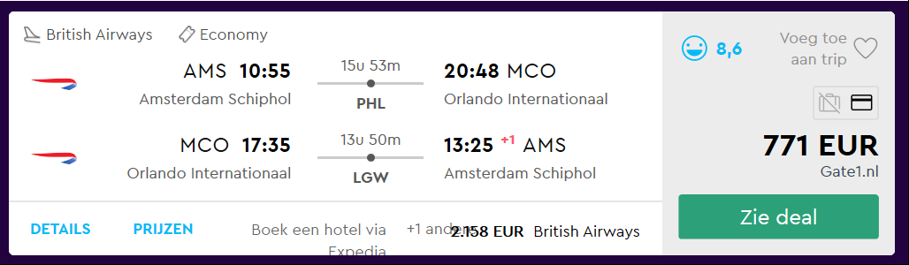 Toen ik zocht voor tickets (via Skyscanner en Momondo) bleek dat alle British Airways (ook via codesharing partners Finnair en AerLingus) vluchten voor AMS-MCO v.v. Inclusief bagage geprijsd waren. Bij Lufthansa, KLM/Delta/AF altijd prijzen excl bagage.
