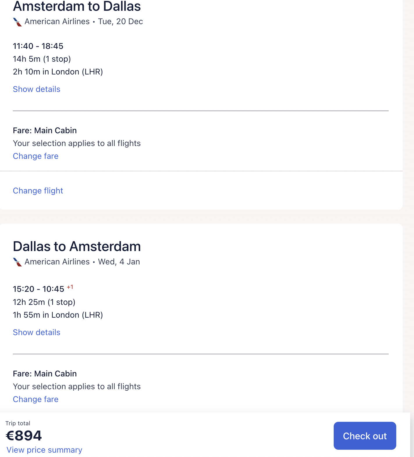 en ik zag bij Expedia AMS>Dallas om 11:40 tussenstop van 2 uur en 10 minuten op LHR