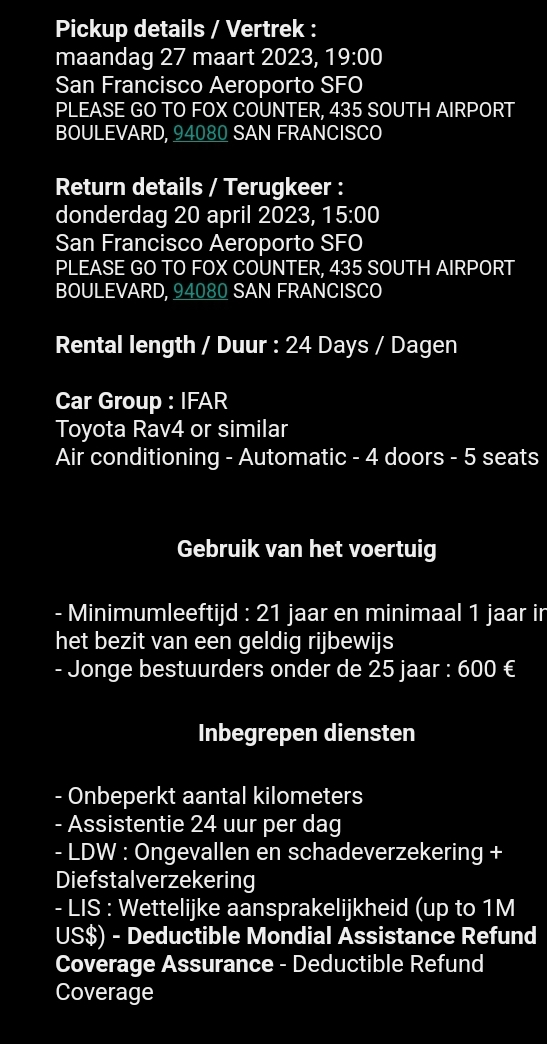 Ik ga met mijn broer een roadtrip doen in april volgend jaar. De vlucht is al geboekt van 8 april tot 22 april. De route is ook al soort van bepaald. Alleen nu willen we een auto gaan huren maar lopen we toch tegen een aantal dingen aan.