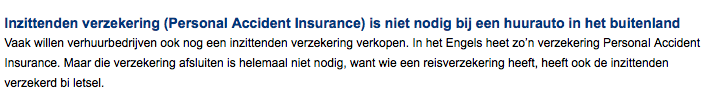 De Nederlandse inzittendenverzekering doet eigenlijk hetzelfde, maar daar kunnen je inzittenden niet terugvallen op hun reisverzekering, wat de meesten (mag ik hopen!) wel hebben als ze naar de USA gaan. Ik verzeker de inzittenden inderdaad altijd wel mee als ik in Nederland een auto huur, want dan neem ik vaak toch mijn kinderen of andere passagiers mee om die reden.