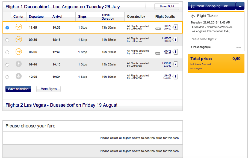 Ik lees op het forum hier dat er goedkope vluchten zijn via Lufthansa. Wanneer ik op hun site naar vluchten zoek van Düsseldorf > LA (op 26 juli 2016) en van Las Vegas > Düsseldorf (op 19 augustus), krijg ik enkel heenvluchten en geen terugvluchten. Is het te vroeg om terugvluchten te boeken op die datum, of doe ik iets fout? Bedankt!