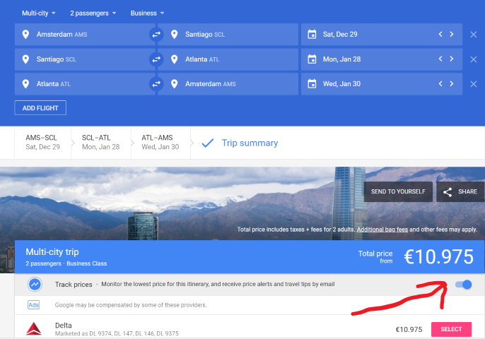 Je kunt op Google gewoon een price alert instellen voor elk willekeurig itinerary, ook als dat een "multi city" trip is.