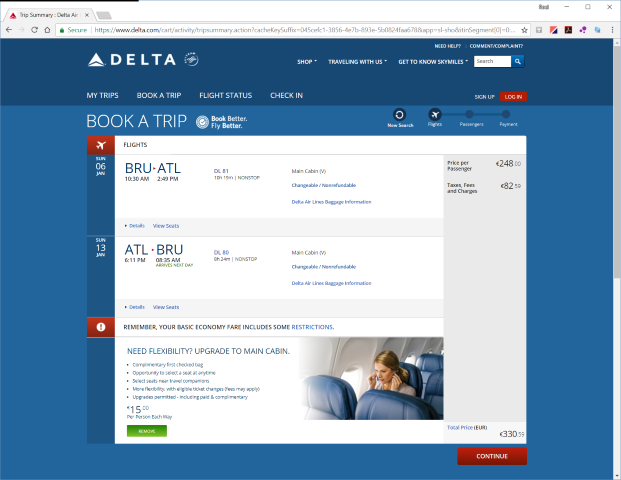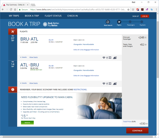 De reguliere fare van Delta/KLM is EUR 330.59, en dat is gewoon inclusief bagage.
