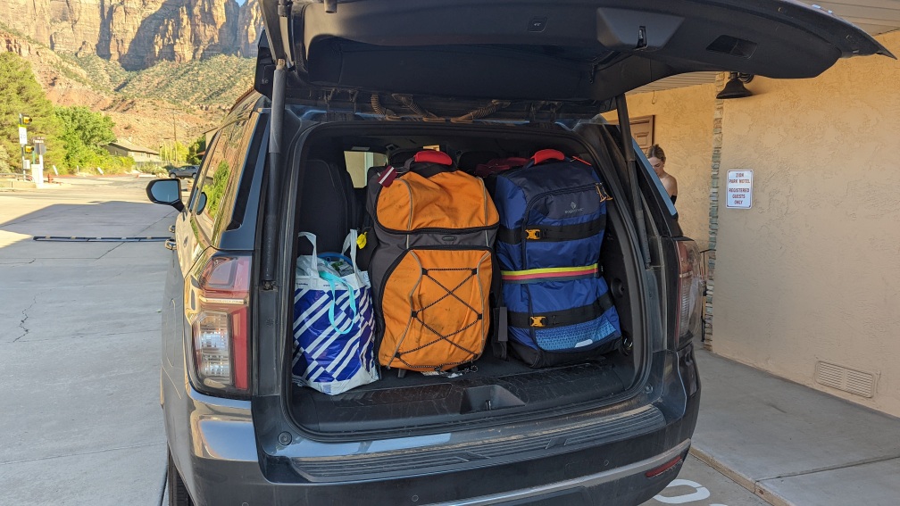 De bagageruimte van een Minivan is beduidend kleiner. Dus als je het met een Suburban niet red, is een busje (12p?) je enige alternatief. Maar dan kom je weer op de rijbewijsdiscussie. Mag je als Nederlander met een B-rijbewijs een 12 persoons bus rijden in de VS.... (er staat nog een rij met 4 grote trolleys in de achter de 2 duffelbags)