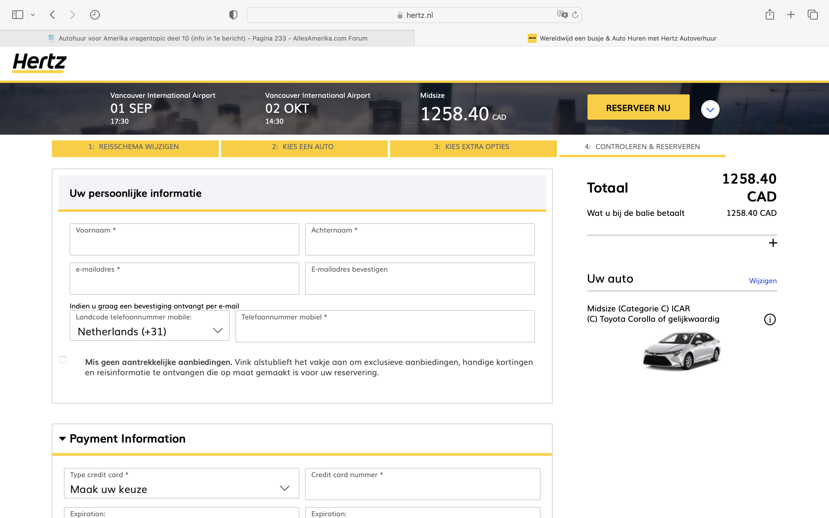 Ben je ingelogd?, zoja even uitloggen nadien laten koppelen via de Alpha email van Hertz(indien dit mail bruikbaar is voor Canada reserveringen).