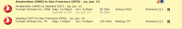 Let op als dit de volgende vlucht betreft. Dan is dit met een overstap in Istanbul en dan heb je immigrations nog niet gehad. Bovendien duurt die overstap acht uur en drie kwartier. Succes en veel plezier bij de voorbereiding.gompie schreef:13-6-2015 / 11-07-2015 Amsterdam > San Francisco vv met Turkish Airlines € 602 pp weliswaar met 1 overstap maar ach dan heb je de immigratie al gehad.Jedinja schreef:Wij hebben via tioga tours een prijs gekregen. Rechtstreeks naar SF en rechtstreeks terug vanaf LA, 4 personen (2 volw en 2 kinderen met eigen stoel) voor €2880, dus gemiddeld €720 pp. Vertrek halverwege juni en terug halverwege juli. Is toch wel een redelijke prijs?