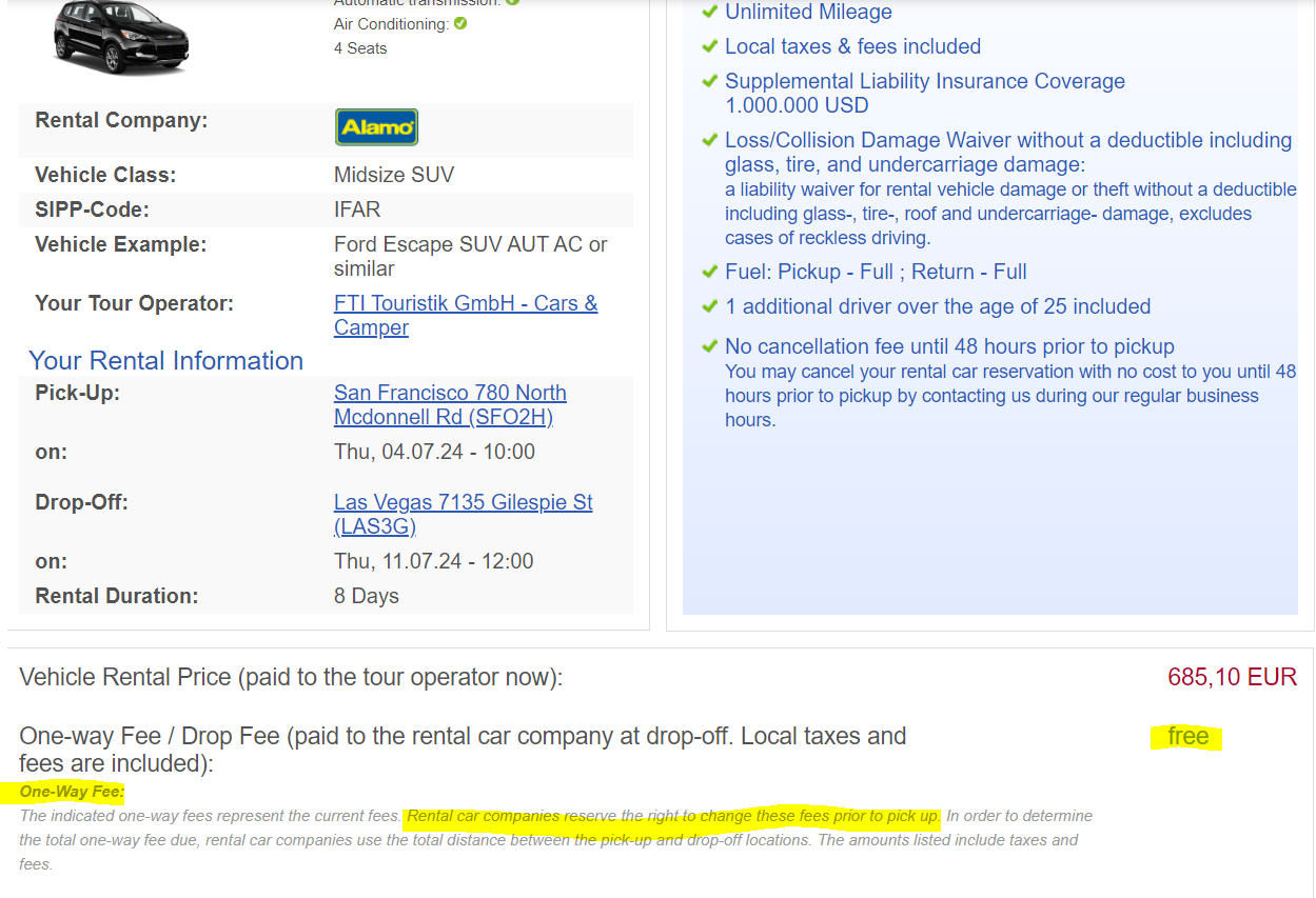 Maar moet ik hier nu uit afleiden dat er tss SFO en LAS dan geen one way fee is wanneer je boekt via usadrive.de? Want via andere sites dan weer wel....