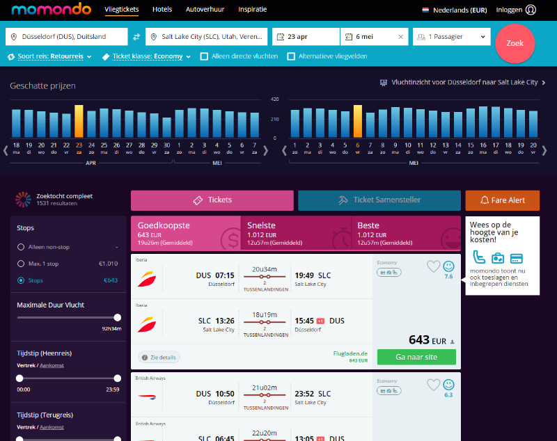 Welke datums heb je gezocht? Ik ben ook aan het zoeken vanaf Dusseldorf naar Salt lake city rond 27 april heen en rond 13 mei terug, echter krijg alleen prijzen van €700~800