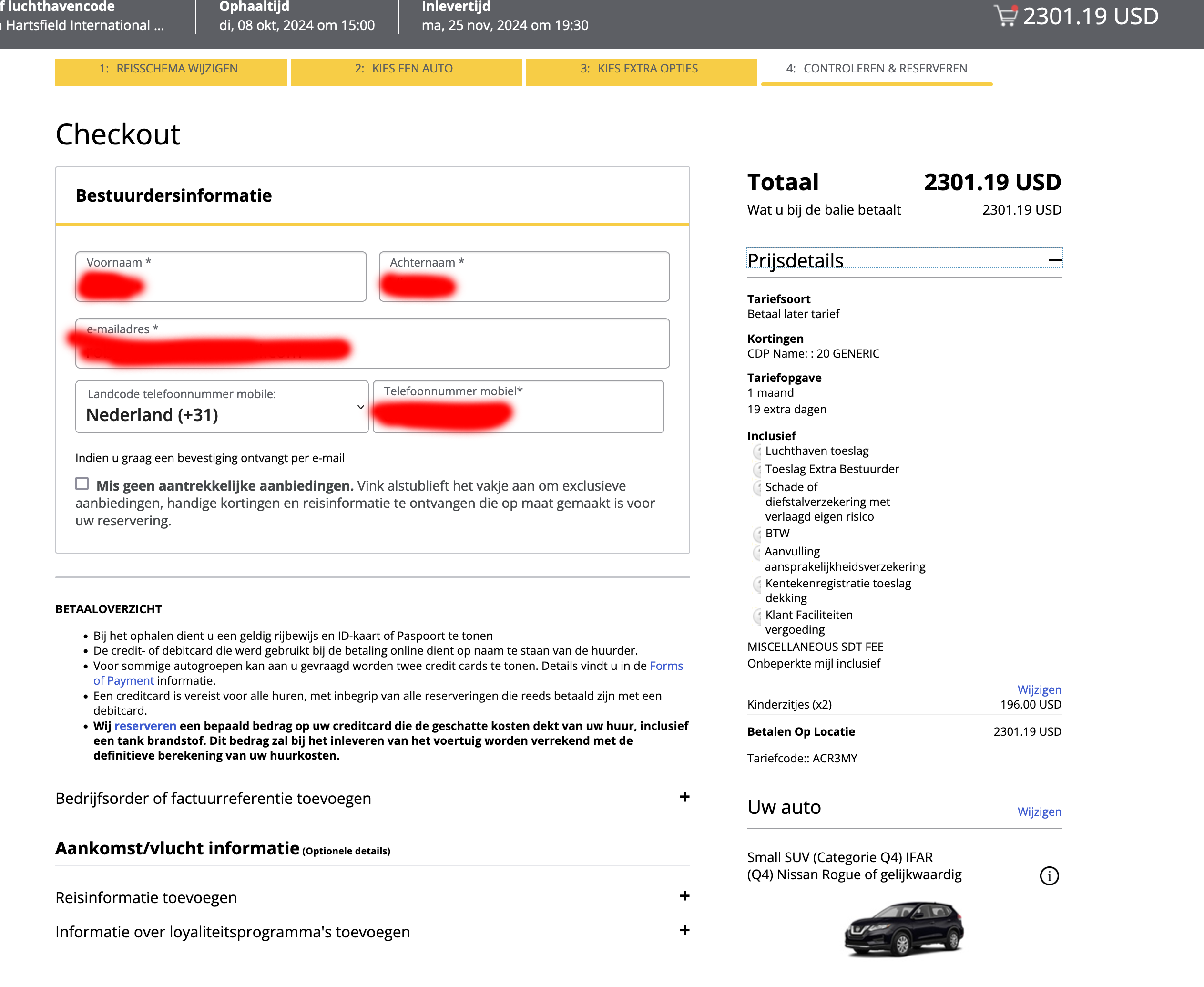 Heb je al eens een search gedaan via Booking? Ik kom dan op 2200EUR uit incl. extra bestuurder en 2 kinderzitjes. Geen verzekeringenRobv85 schreef: ↑25 jan 2024, 10:45Zojuist een auto gereserveerd bij national.de als gast met de kortingscode. Dit is by far de goedkoopste optie die ik nu kon vinden.